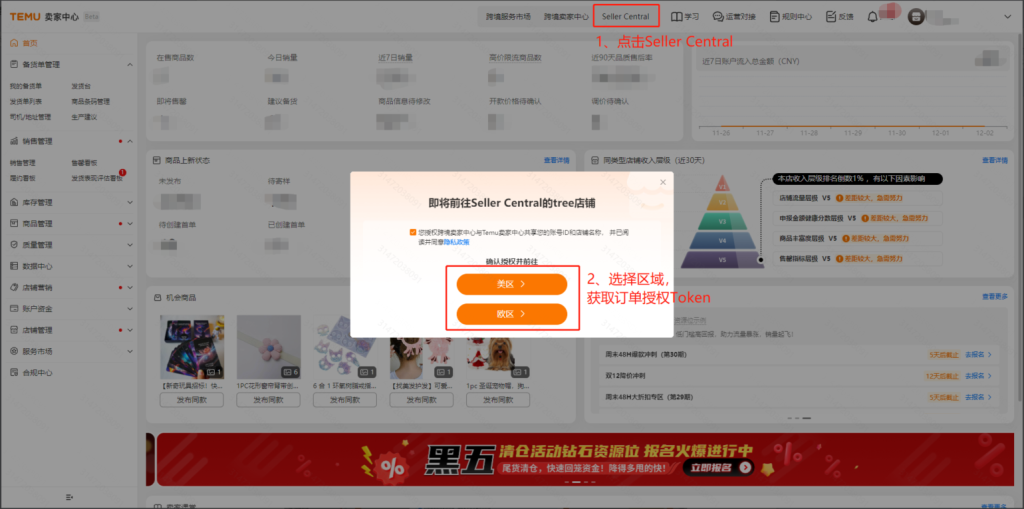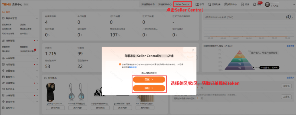 1.半托管店铺授权step1:【Temu后台—点击右上角Seller Central—选择对应区域—切换到订单管理—同意政策—点击确认授权并前往。】