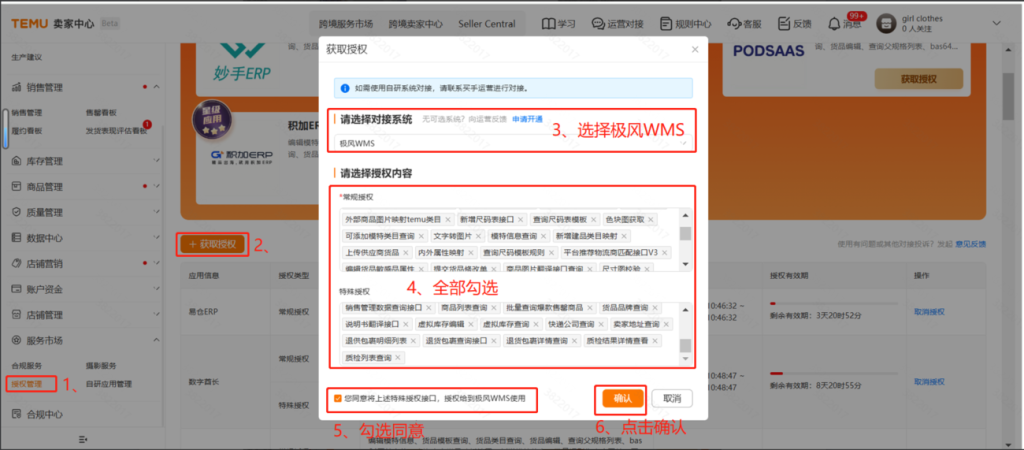 2:【授权管理—点击获取授权—选择极风WMS—全选—同意确认授权即可】