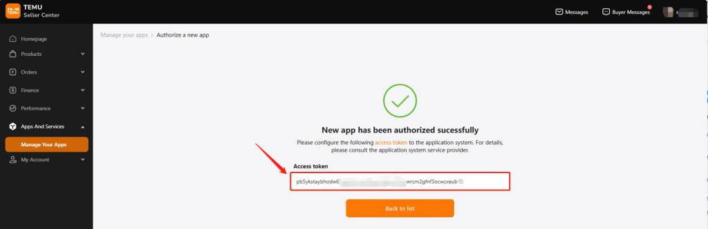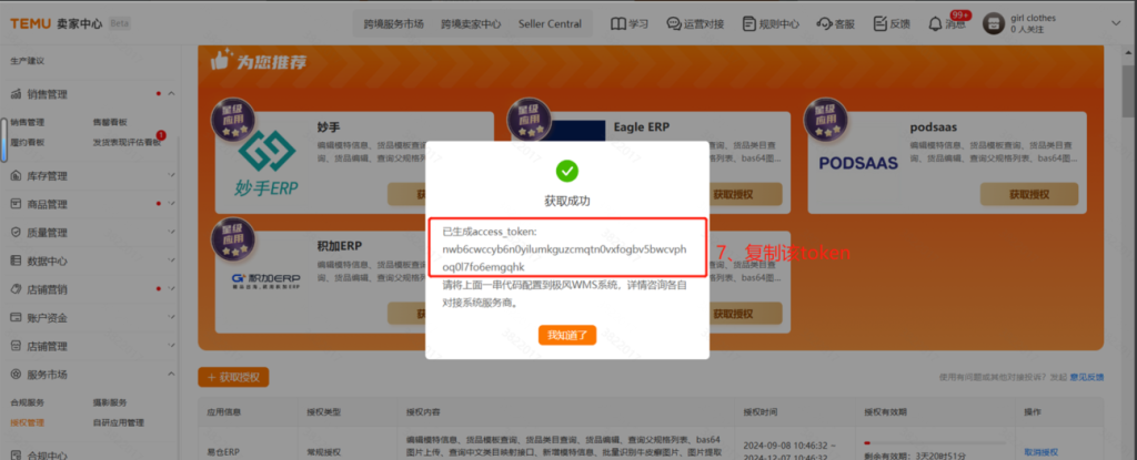 step3:【点击确认后,将Access_token复制粘贴到极风WMS授权店铺弹窗页面】授权成功后,列表会新增一条店铺数据,您可以通过极风OMS完成订单处理、产品映射关系配对等操作。