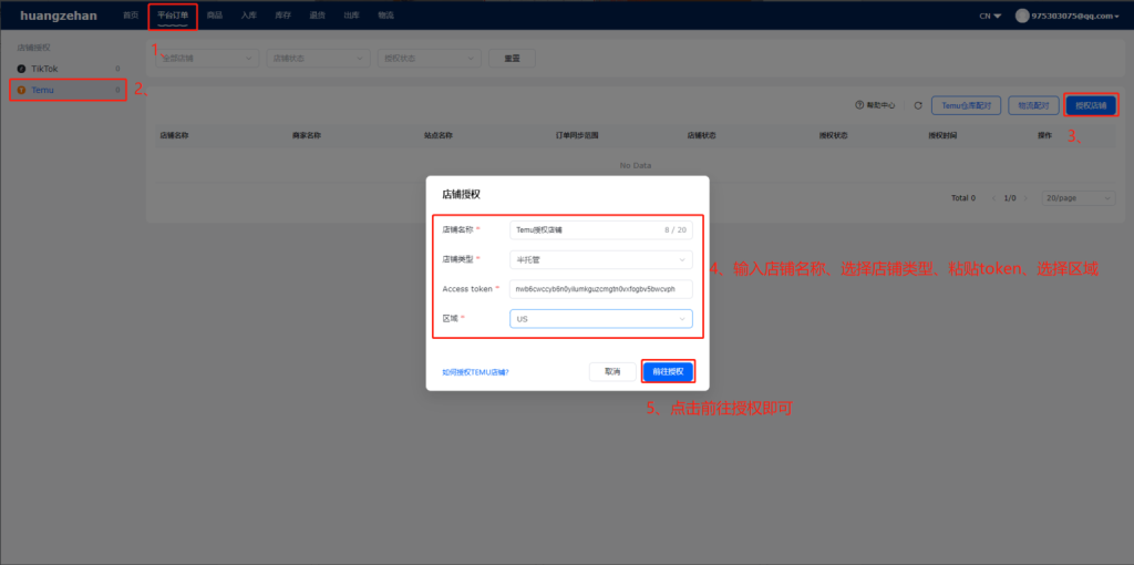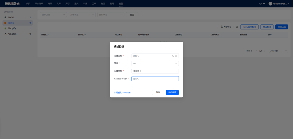 Step4: 打开极风OMS系统,前往:设置-店铺授权-Temu 点击“授权店铺”填写授权信息及刚才复制的Acess Token后确定即可