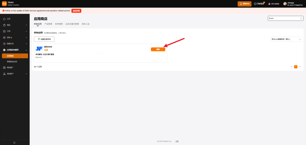 step1:进入Temu卖家后台,点击 Manage your apps > Authorize a new app。搜索JFWMS,点击“授权